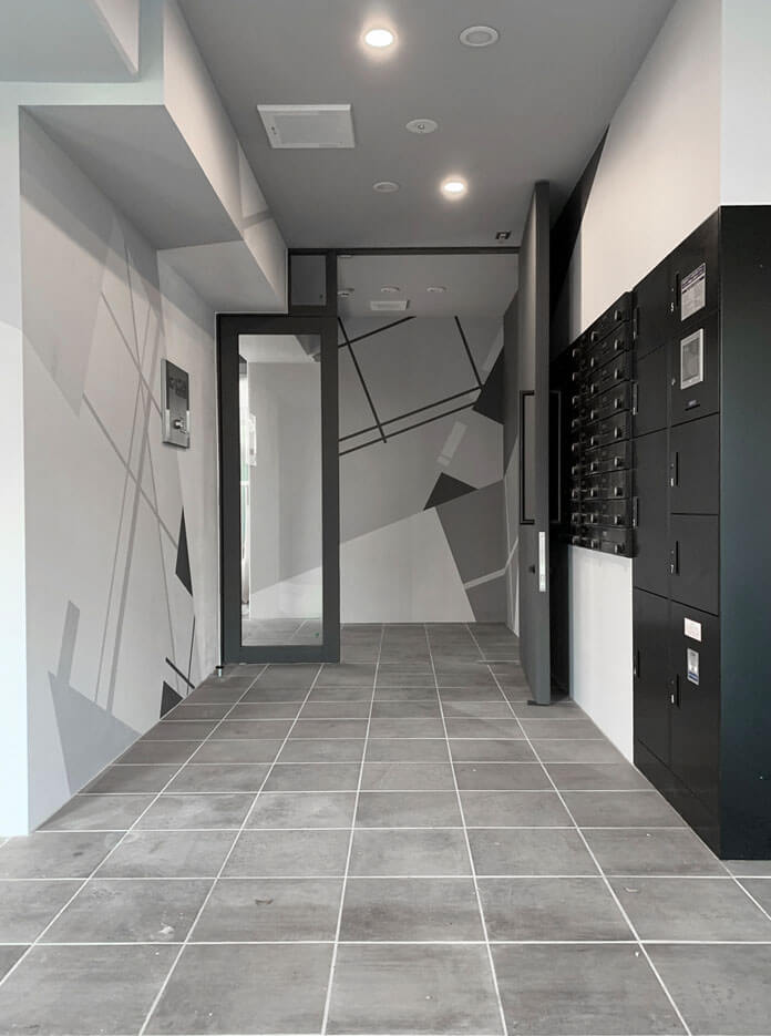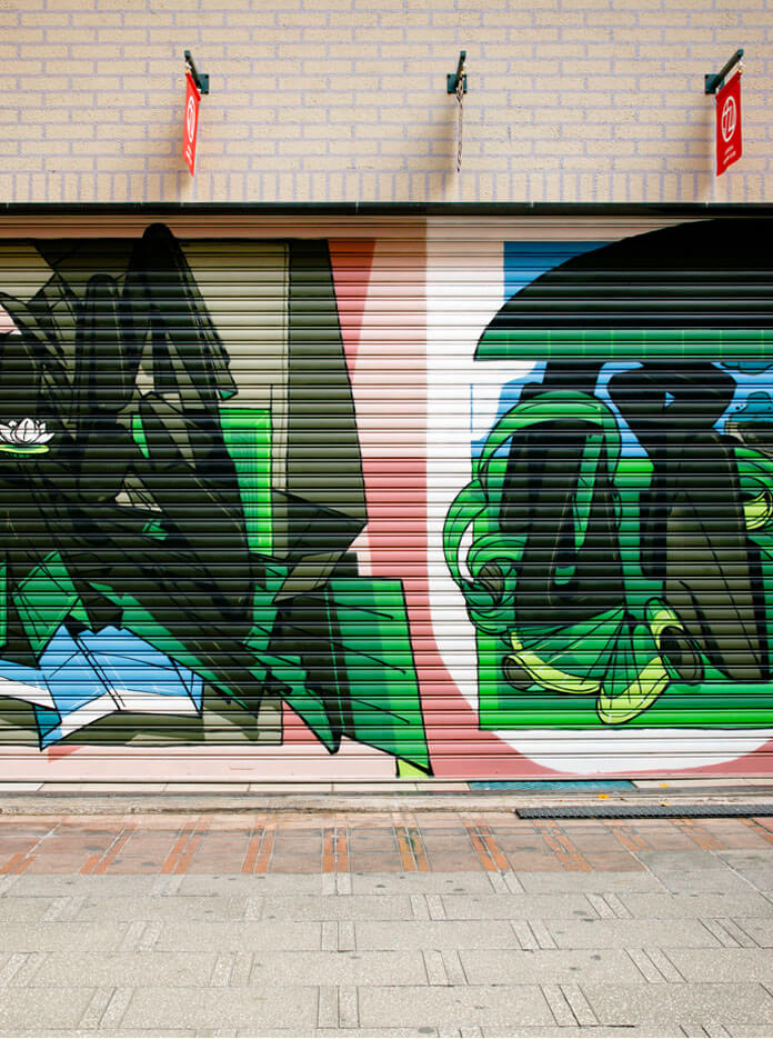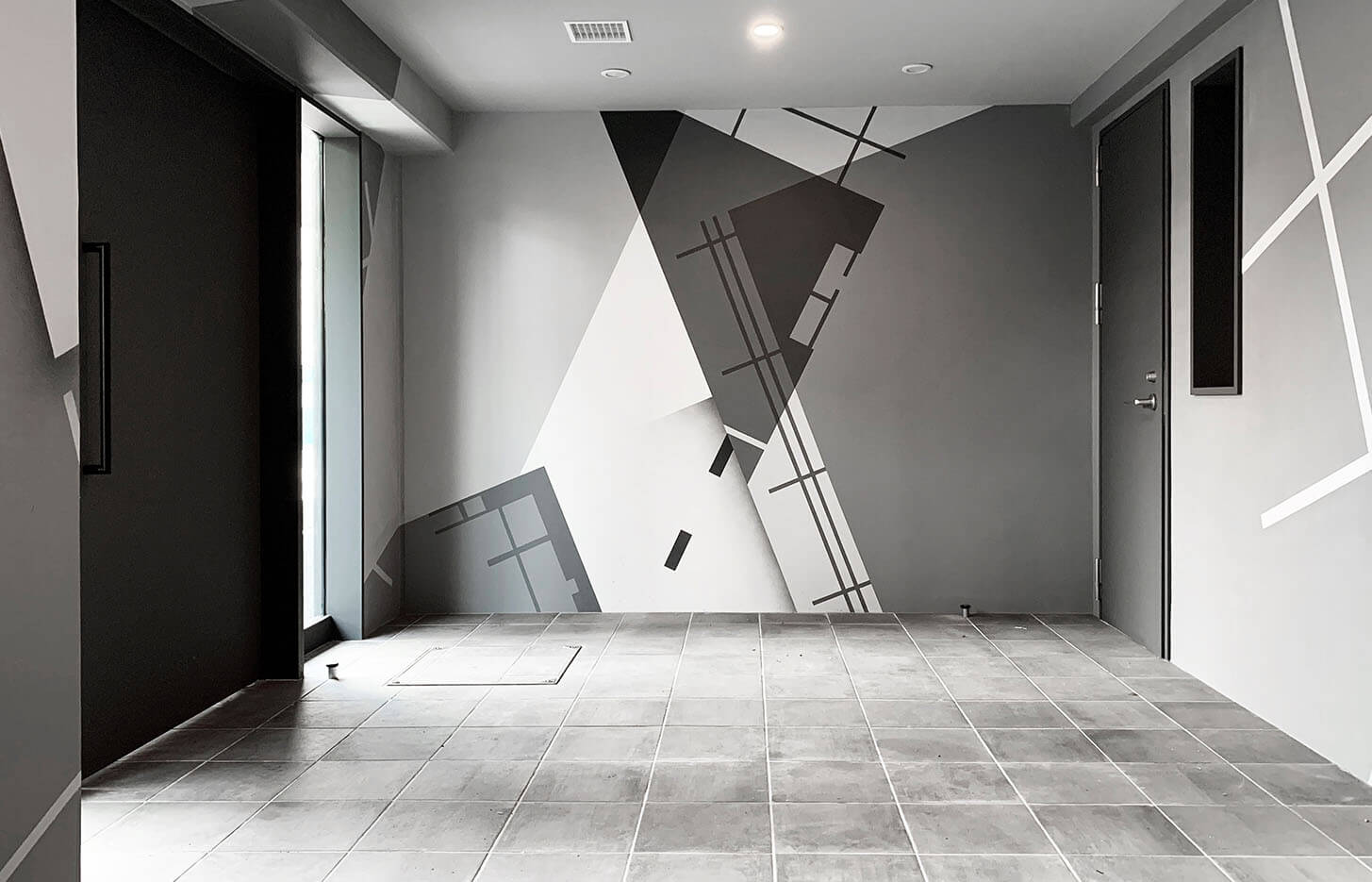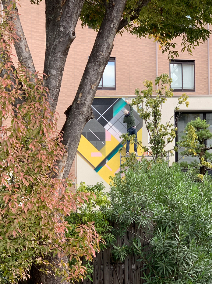 上記のような取り組み以外に、ビル一棟分の壁面をペイントした大規模な作品からシャッターや内装に至るまで様々な壁面に施工しています。作業現場も新築と改装、または現在使われているものや通常営業の合間といった具合に状況も様々です。天候に悩まされることもあれば、壁面が汚れてしまって補修や洗浄が必要な場合もあります。外壁は直射日光や雨、風、埃、排気ガスなどに晒されているため見た目以上に汚れや劣化が酷く作業環境は常に何かしら問題を抱えています。私たちは現場でそれらの問題を事前に予測しながら、不測の事態が生じても即座に対応し、元の壁面の状態がどうであれ、アーティストの作品が美しく鮮やかな状態で残るよう様々な工夫を施します。