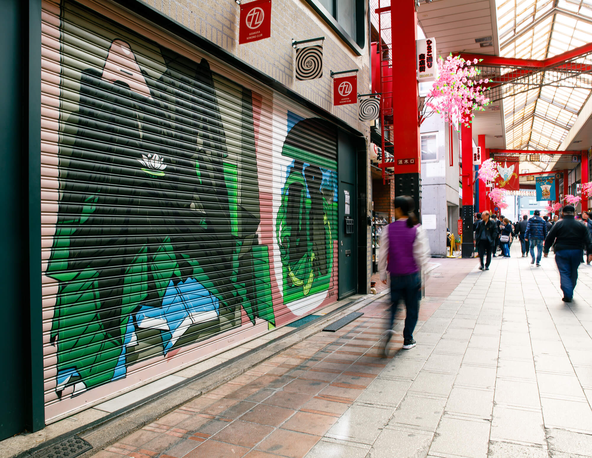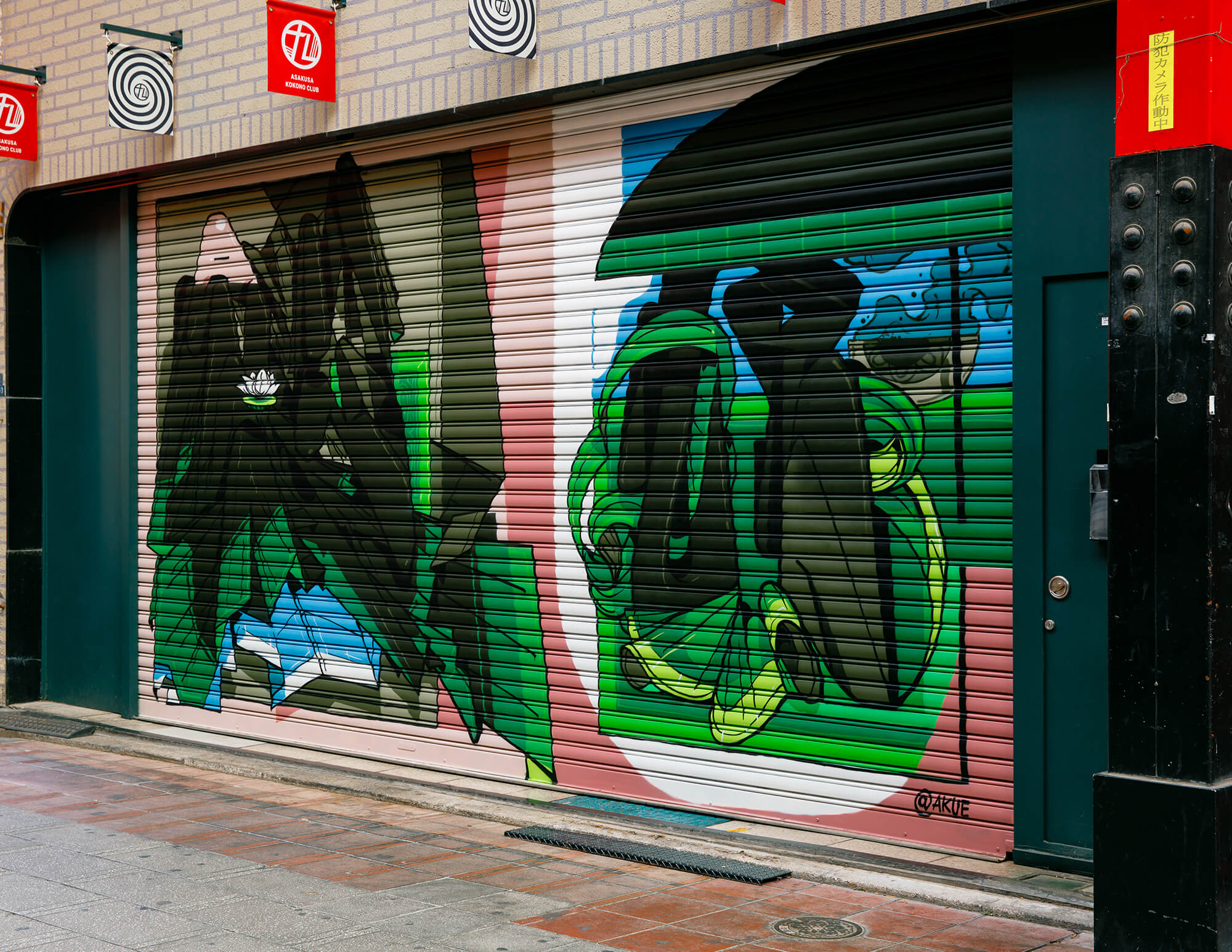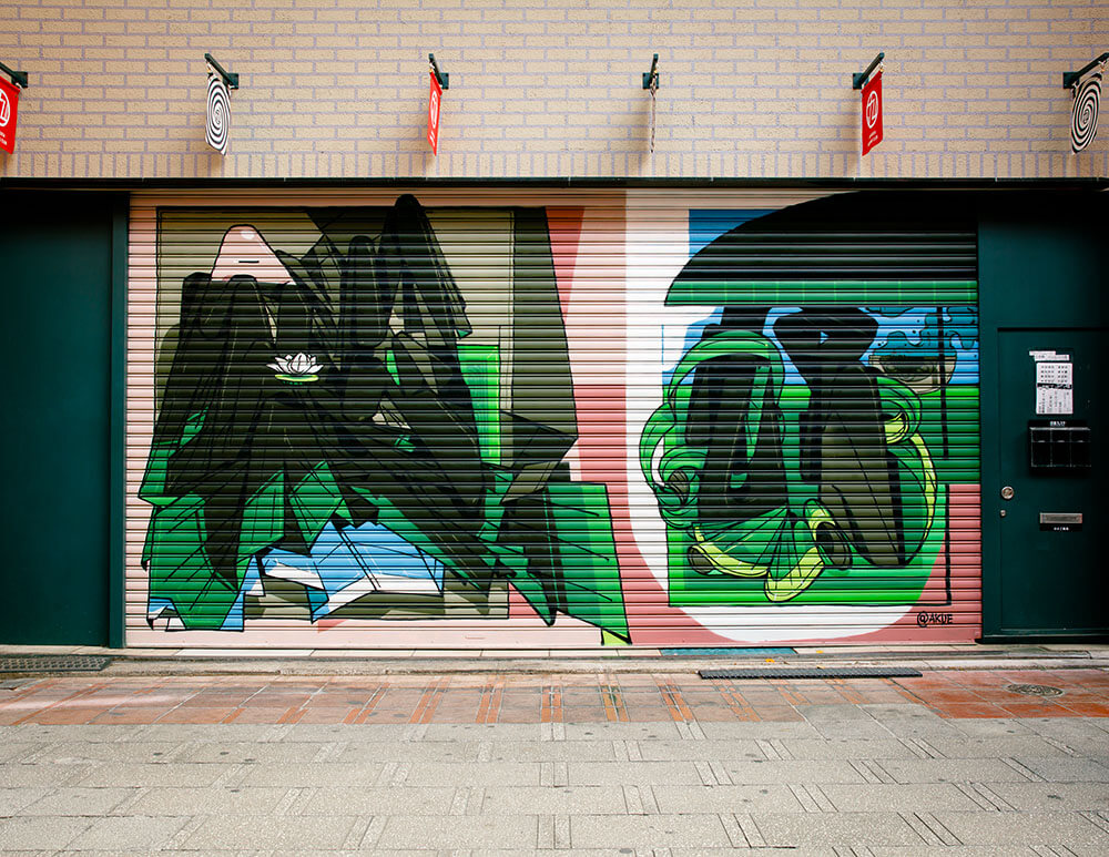 東京/浅草で彼が描いたのは浅草九倶楽部という劇場やホテルスタジオが一体となった浅草の新しいカルチャースポット。その中の「浅草九スタ」のシャッターを自由に使い若い作家の表現活動をサポートできるような役割をもたせたいというご依頼を頂いたところがきっかけだった。彼は蓮や庭園、傘を連想させる抽象的なモチーフを加えながらもレタリングを主役にした自分自身のスタイルを存分に表現した。実物の作品のエネルギーや臨場感が伝わってくる力強い作品が浅草の繁華街を彩っている。