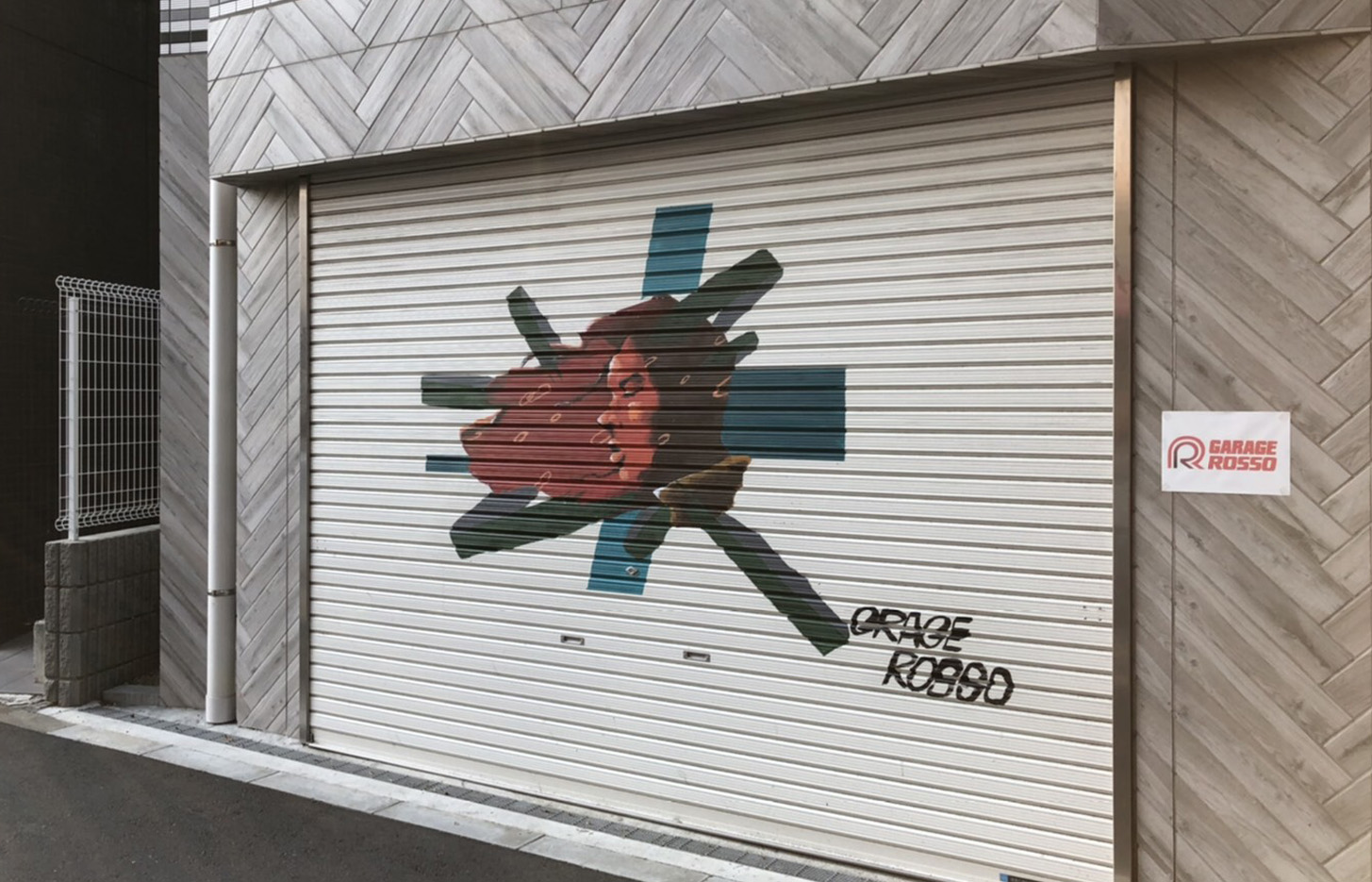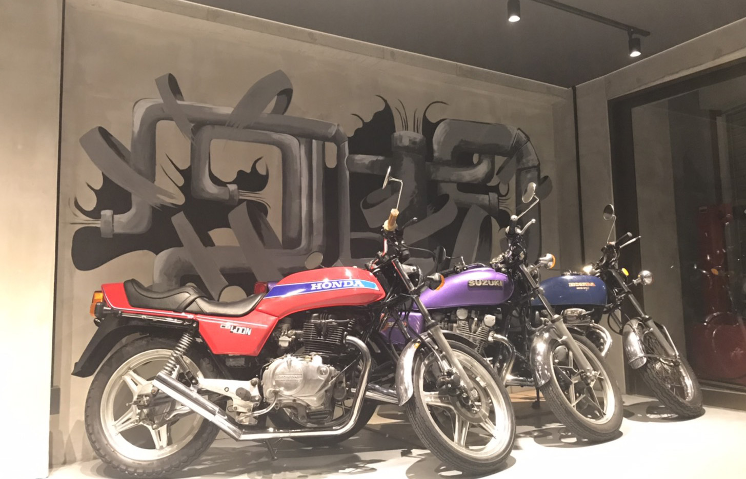 中古バイク販売店をイメージしたクールなデザインに仕上がりました。建物1階のシャッター、店舗の壁面につき自由に見学可。